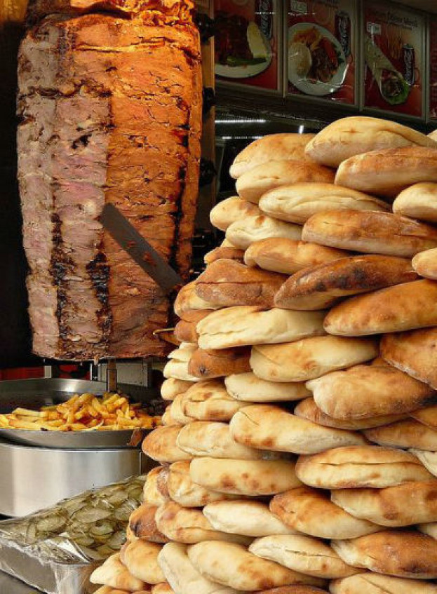 O tradicional churrasquinho “grego” como conhecemos aqui no Brasil, tem origem nos países árabes, mais especificamente na Turquia. É um prato feito a base de carne, que é grelhada verticalmente durante varias horas. Tradicionalmente se utiliza carne de cordeiro, mas alguns “kebabeiros” fazem uma mistura de vitelo, carne bovina, e frango. São servidos no pão pita com vegetais como: cebola, tomate, picles e molho especial se desejar!