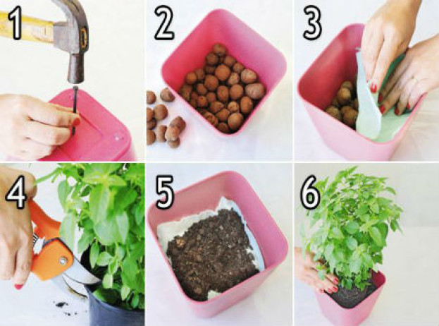 Passo a passo: 1) fure o vazo caso o recipiente não tenha furos embaixo. 2) distribua a argila expandida no fundo do vaso. 3) cubra com a manta bidim. 4) retire a muda ou planta de onde estiver. 5) coloque a terra no vaso. 6) coloque muda e planta no vaso.