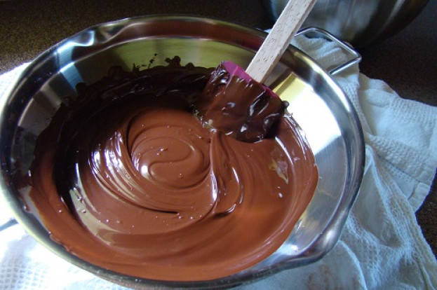 Derreta o chocolate (microondas ou em banho-maria). Cuidado para não deixar queimar. Se for fazer no microondas, coloque sempre de 30 em 30 segundos, sempre mexendo bem. O tempo pode variar conforme a quantidade de chocolate. Um quilo equivale a dois minutos no microondas.