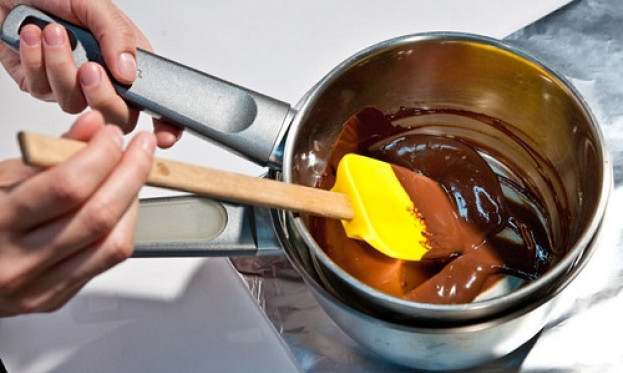Aqueça o chocolate entre 40º C a 45ºC. Abaixe essa temperatura para 27ºC. Para acontecer esse processo coloque 40% de chocolate reservado no início da temperagem. Mexa bem até dissolver tudo. Se necessário coloque mais um pouco de chocolate. Tudo deve estar dissolvido e liso.
