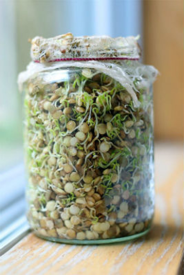 Grãos e leguminosas germinadas são extremamente saudáveis e vão dar um gosto diferente para suas refeições, além de serem super fáceis de fazer. Comece deixando as lentinhas de molho e totalmente submersas de um dia para outro (8-12horas). No dia seguinte, com o auxílio de gaze ou uma peneira, escorra e coloque em um recipiente um pouco maior.