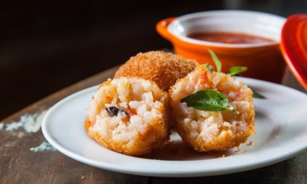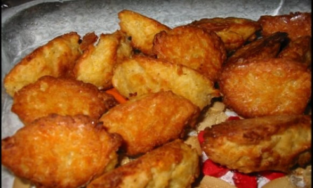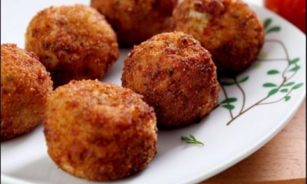 Esse bolinho, ao invés de usar sobras de arroz comum, usa arroz arbóreo, ou seja, arroz de risoto.