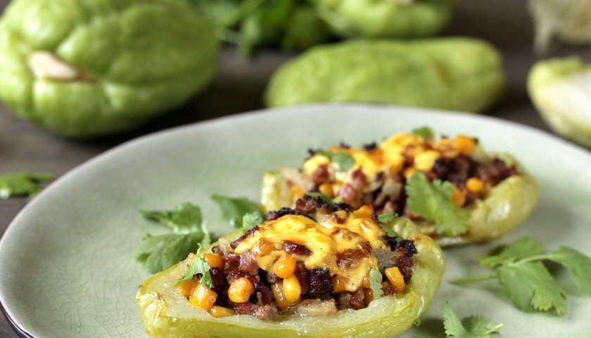 4. Pique um pouco do miolo do chuchu, pique e junte à carne refogada. Coloque o chuchu em uma fôrma untada, coloque o recheio por cima, polvilhe com o queijo ralado e leve ao forno alto, preaquecido, por 15 minutos.
