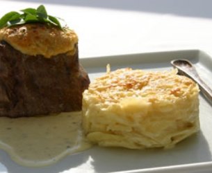 Filet Mignon com Crosta de Parmesão, Molho Blue Cheese e Gateau de Batata